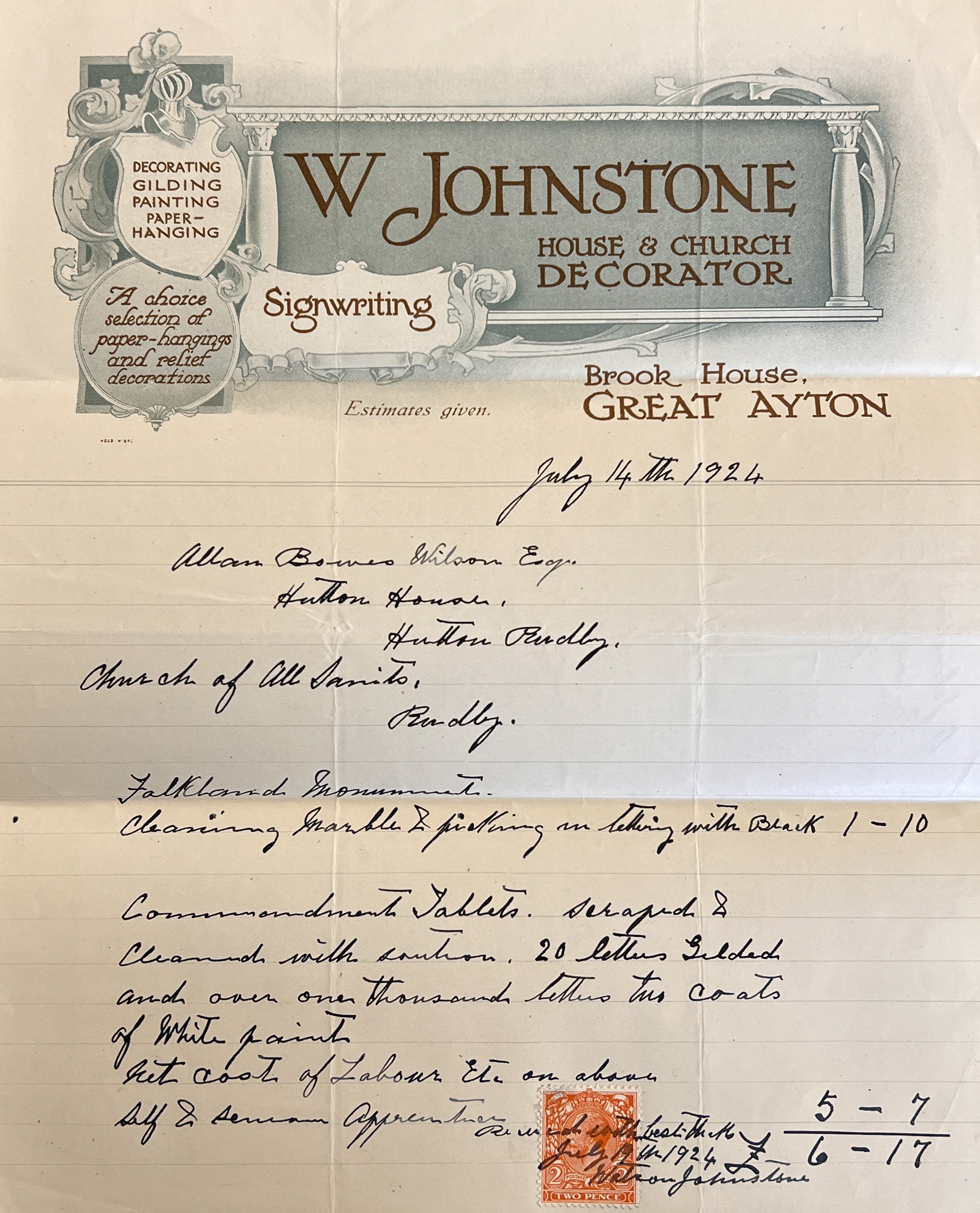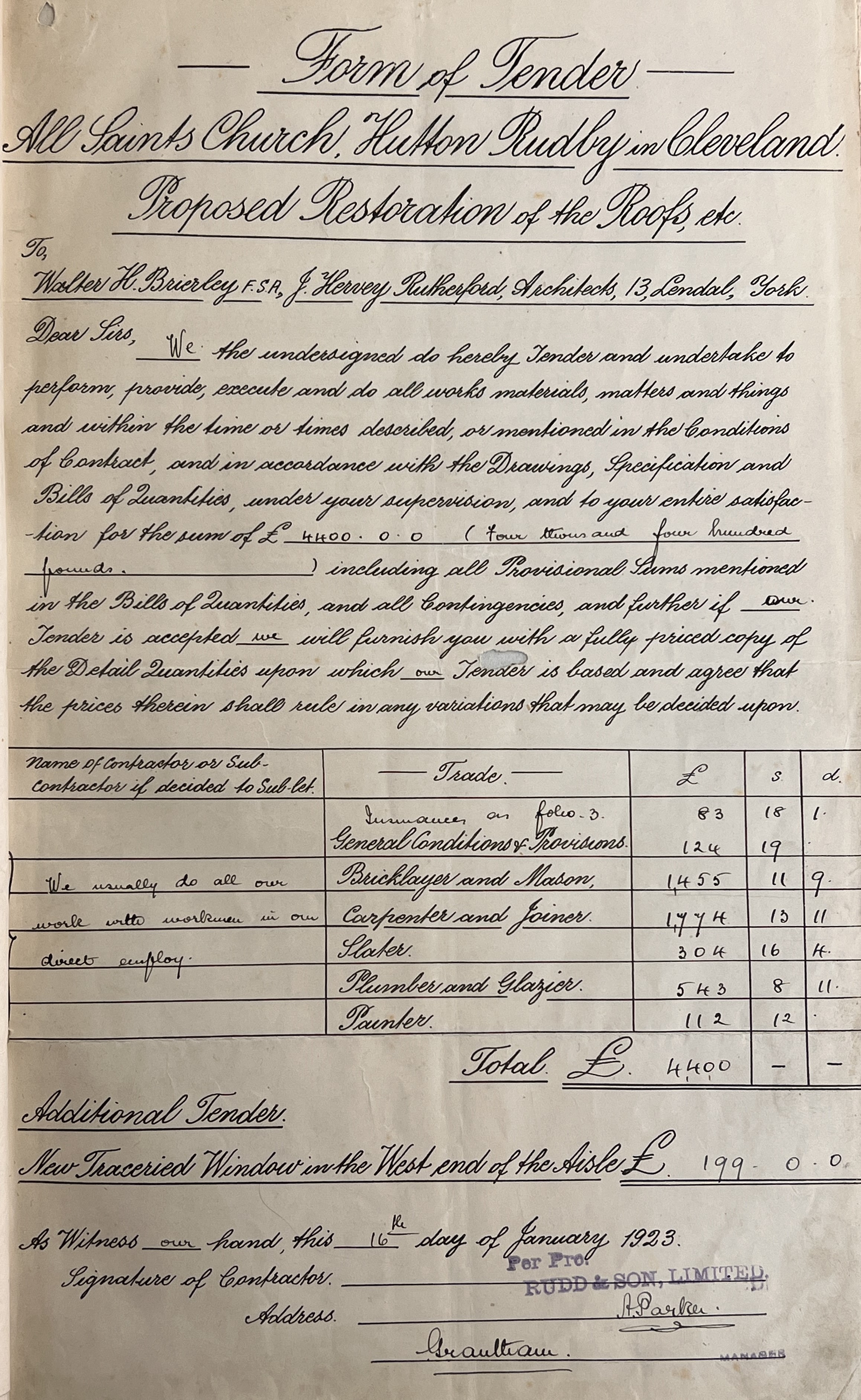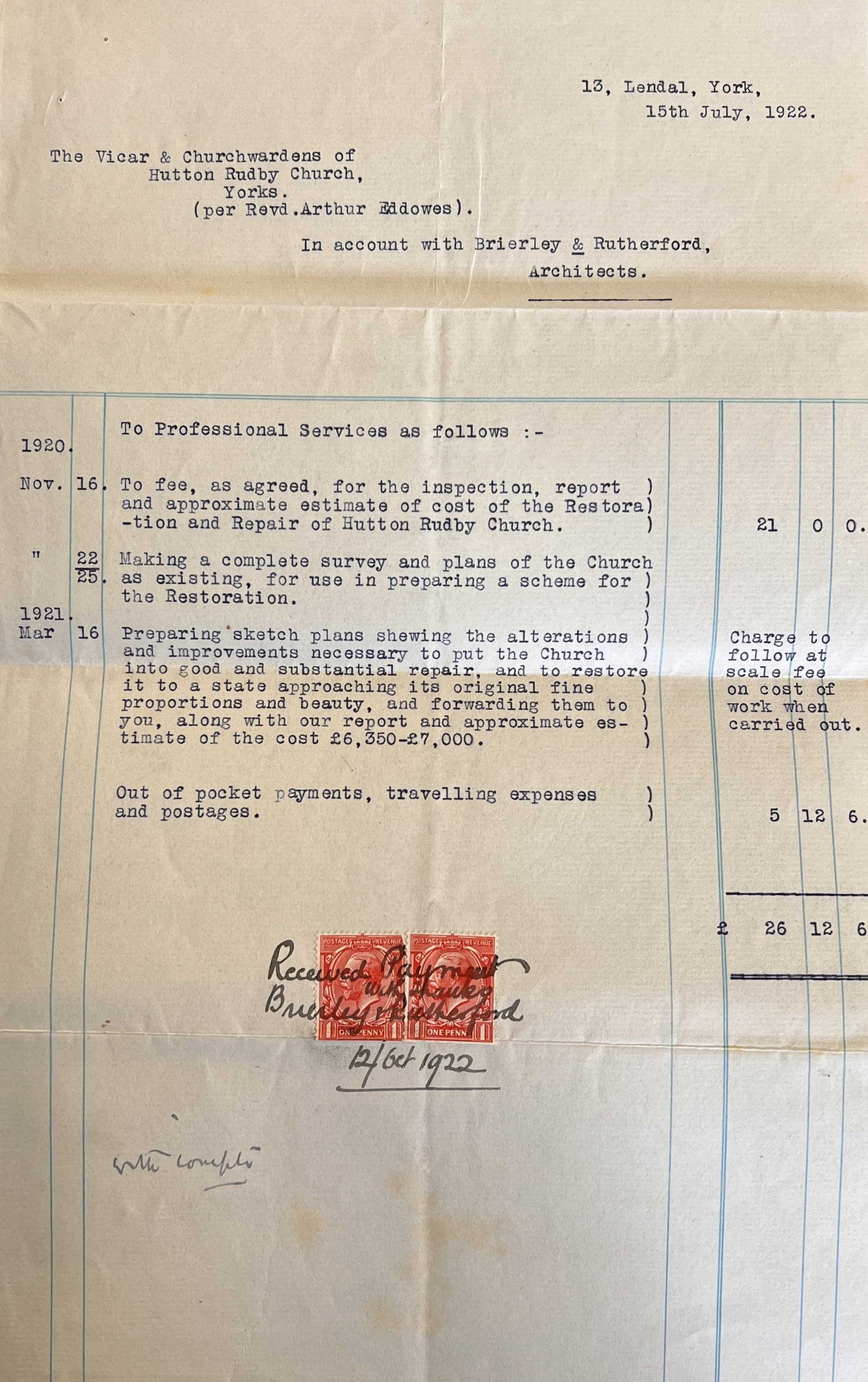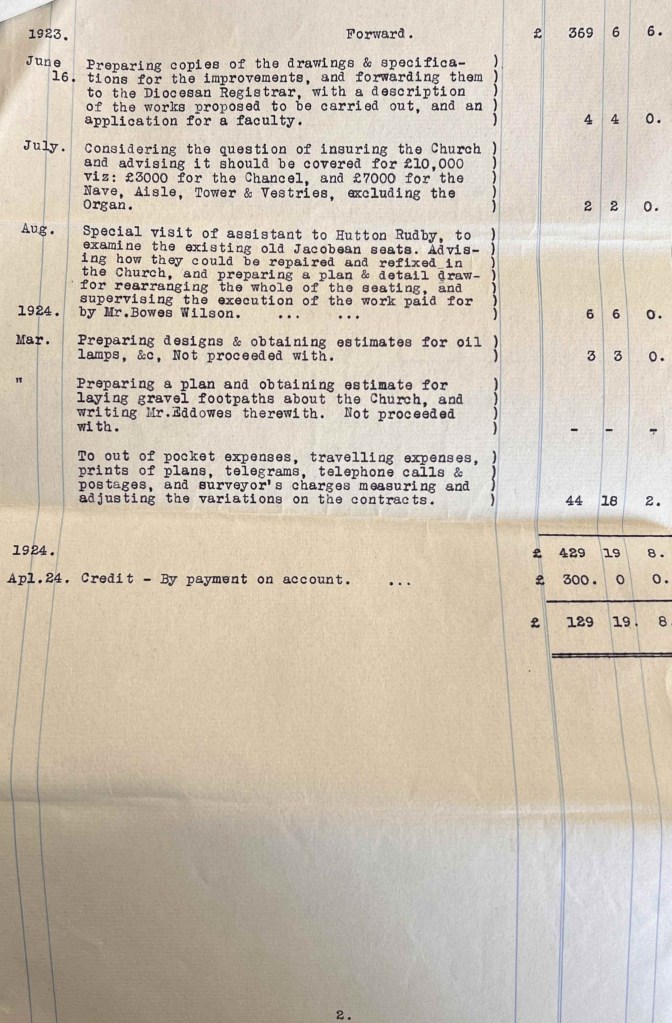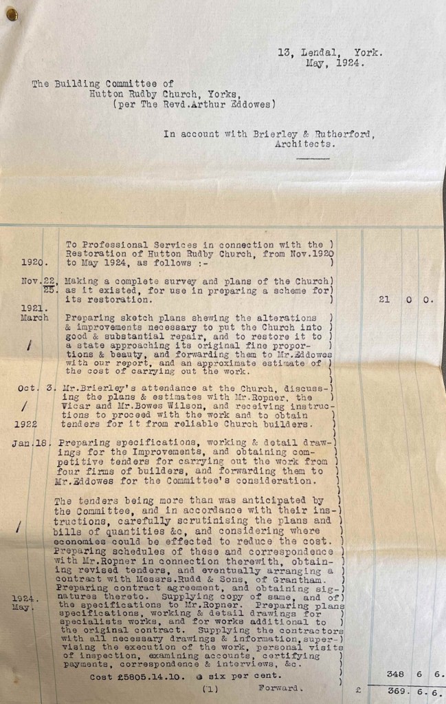 Brierley and Rutherford’s plans for Hutton Rudby, All Saints church were commissioned and approved by Reverend Arthur Eddowes. From material within the parish record collection, we know that the building work was undertaken by Rudd and Son Ltd, who successfully tendered for the work on 16 January 1923 for the sum of £4400. The previous year, on 15 July 1922, Brierley and Rutherford had submitted their bill of £26 12d 6s for preparing plans, noting that their estimate of the total cost of the restoration would be in the order of £6350-£7000. After completion of the works, in May 1924, Brierley and Rutherford submitted itemised costs for their input to the project, which totalled £429 19d 8s (see below).