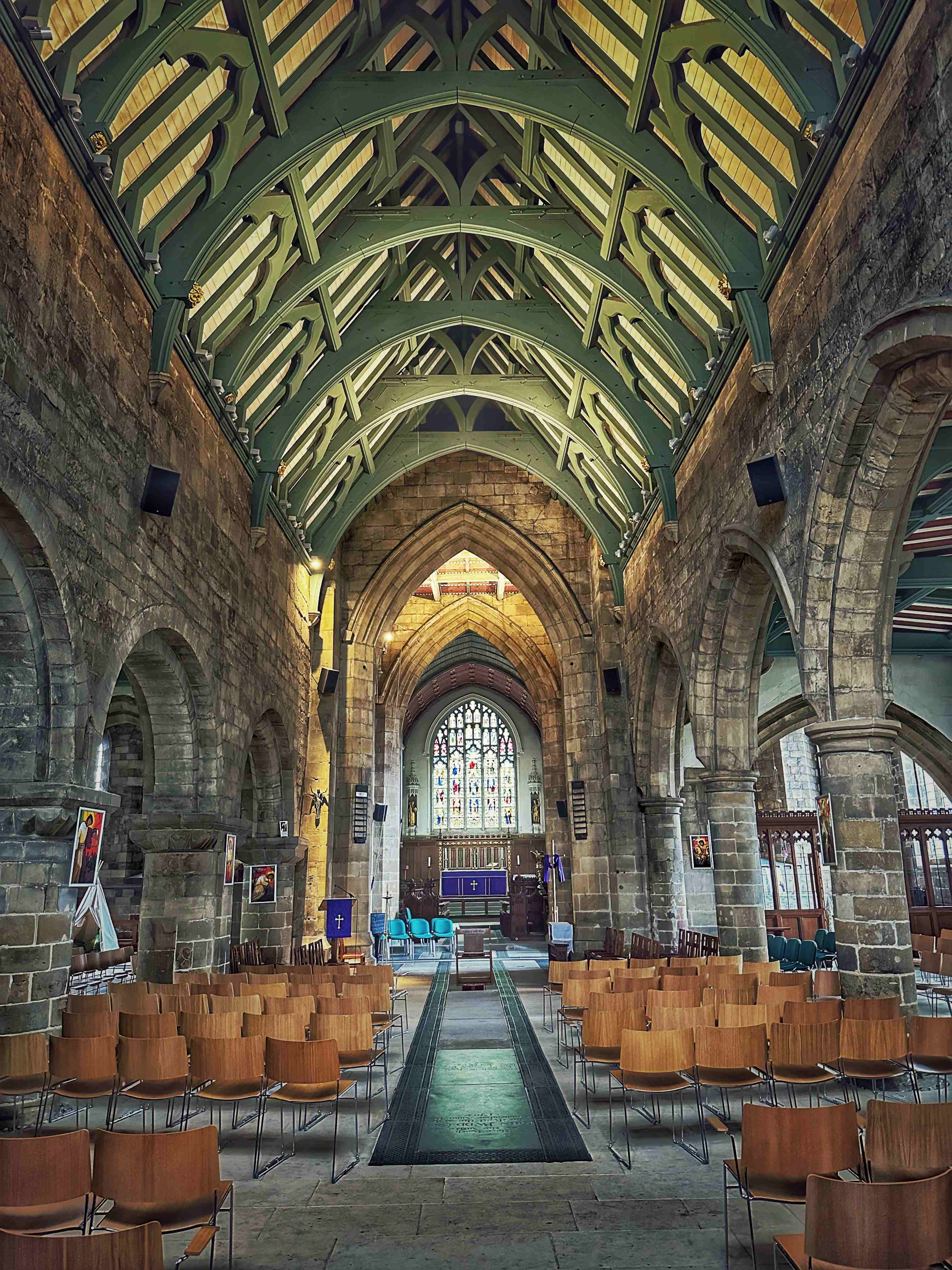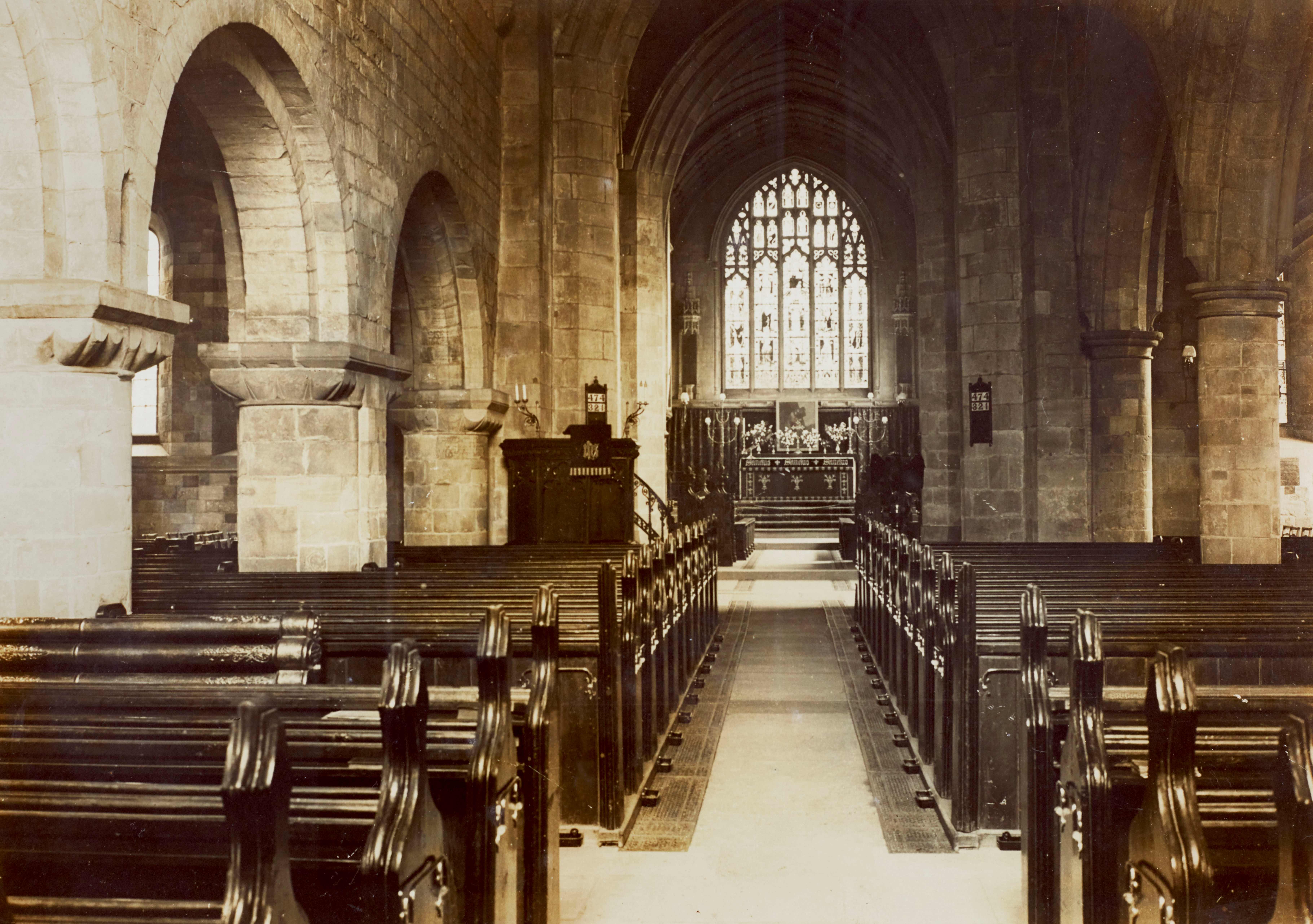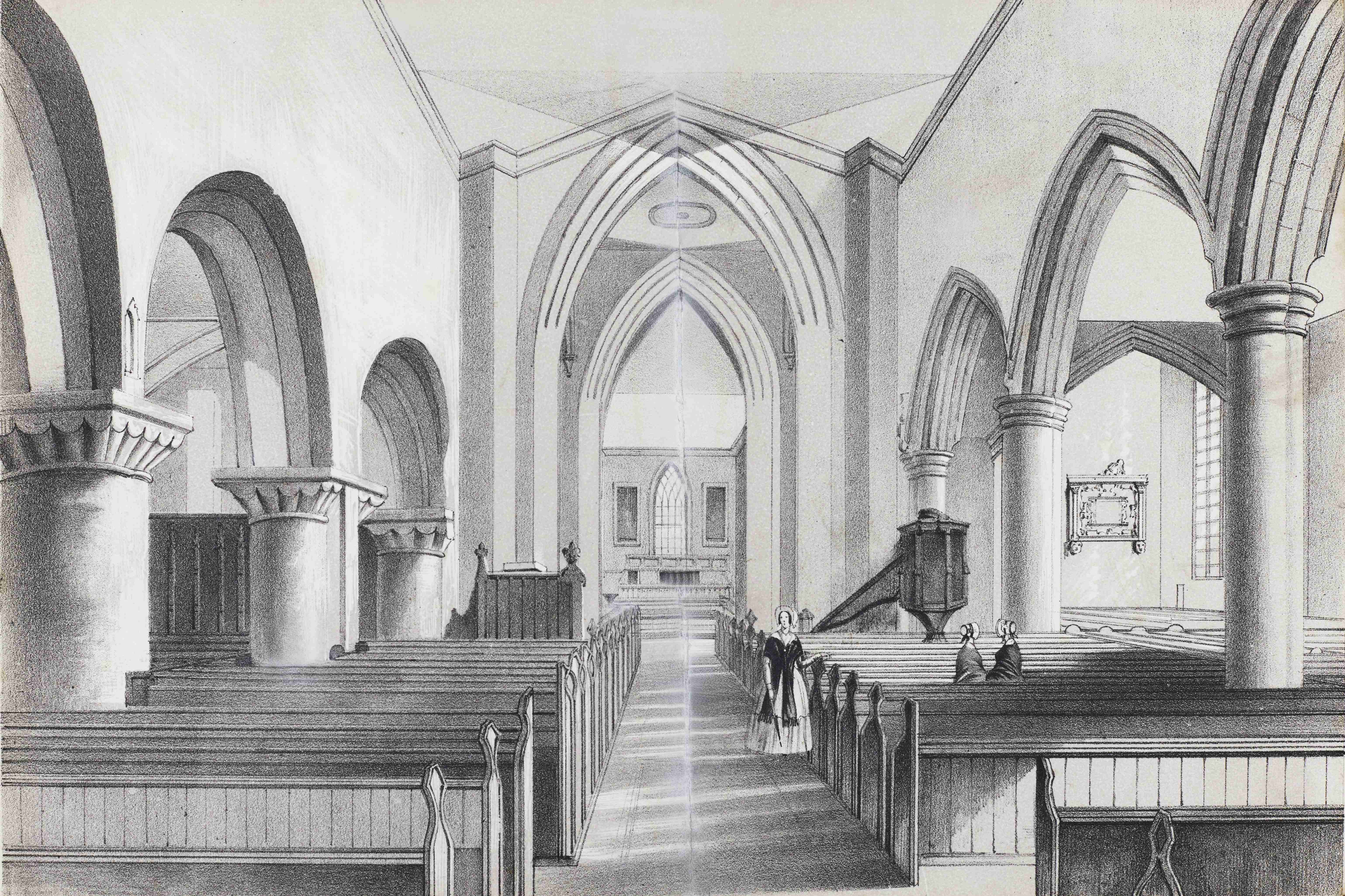 - Left: Engraving of interior view of All Saints, Northallerton prior to the 1884 restoration, looking east down the nave towards the altar and chancel [PR/NO]
