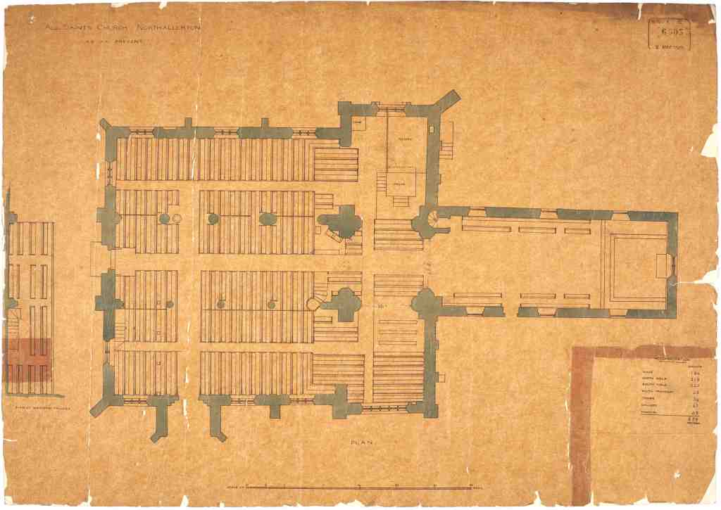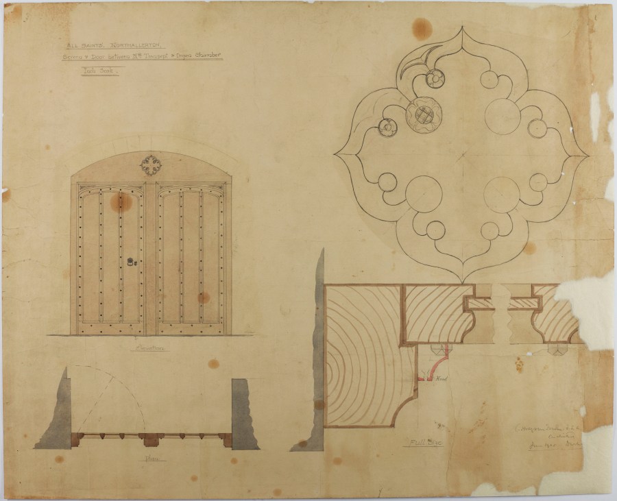 The Hodgson Fowler collection contains 43 architectural drawings for the restoration of Northallerton, All Saints between 1882 and 1884 [see the full list in our online catalogue: ZRA 48]. These include plans, sections and elevations ‘as at present’, and designs for proposed restoration.