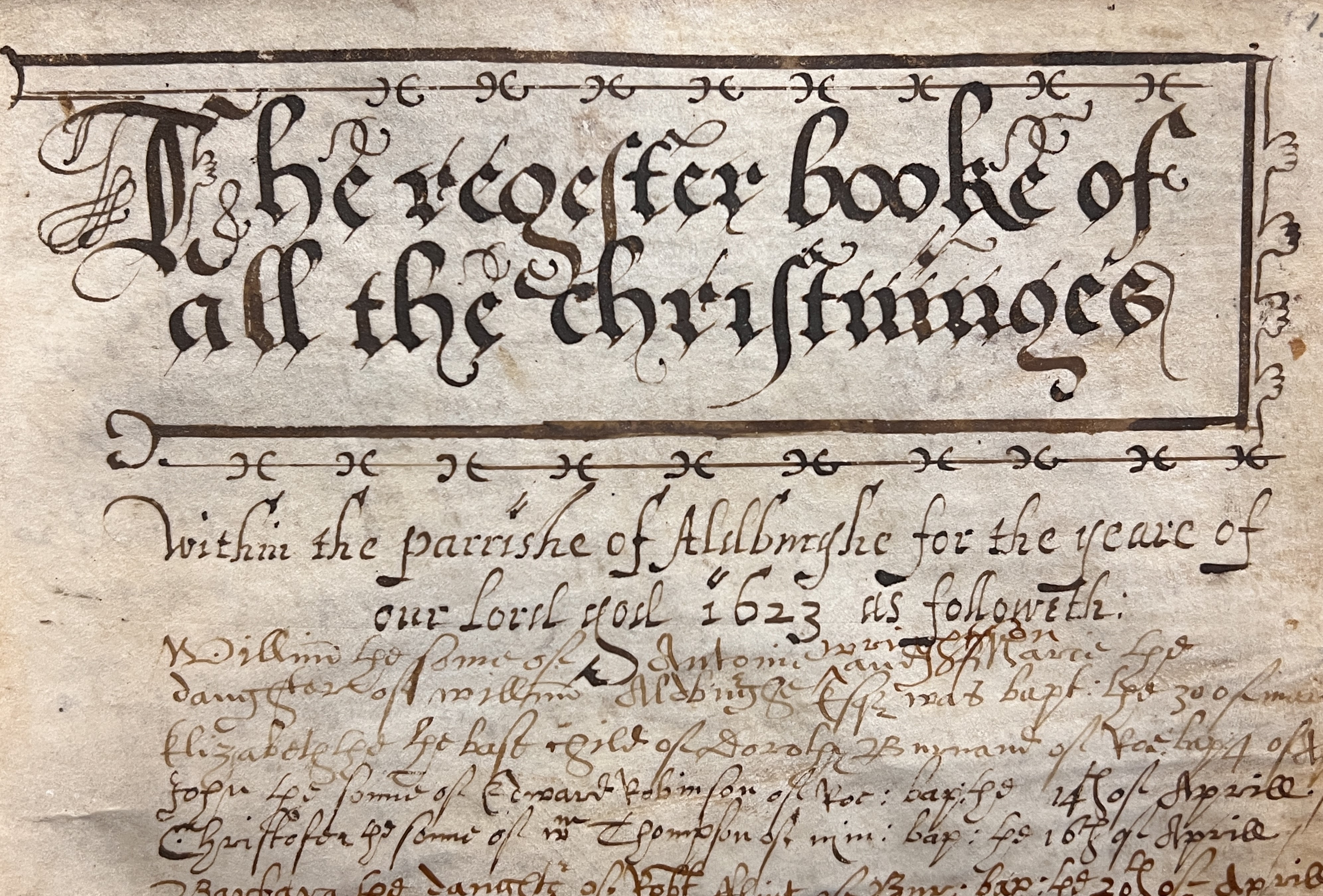 Each of the beautifully defined headings for the different sections of the parish register for recording ‘christninges’, ‘maryages’ and ‘buryalls’ from the years 1622/1623 in the parish of Aldborough, St Andrew [PR/ALB 1/1]