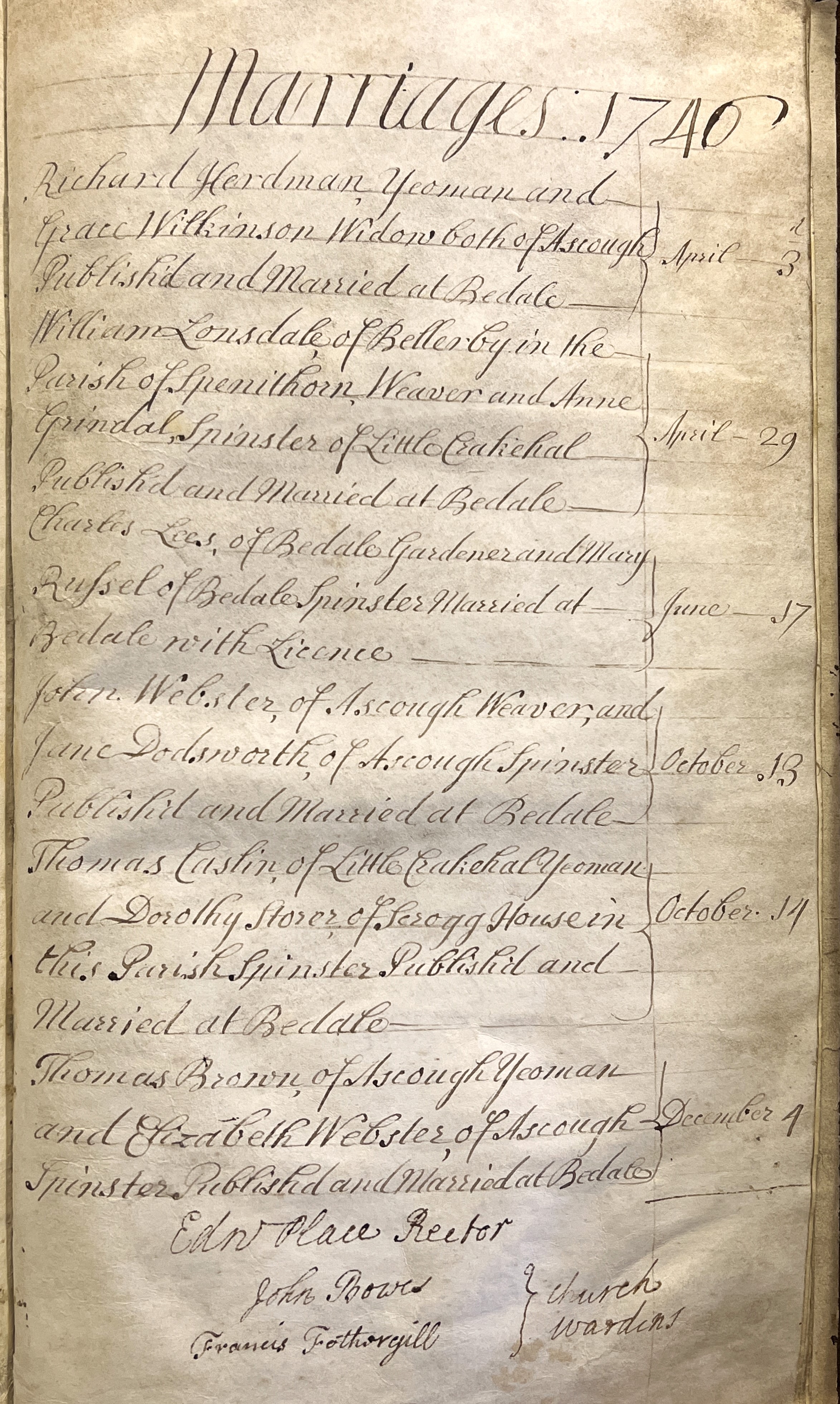 Other parish-related information may be found written in the parish register, such as this list of Strange Preachers 1746-1749 on the opposite page to records of marriages in 1746 in the Bedale, St Gregory register of baptisms, marriages and burials, 1716-1747 [PR/BED 1/3]