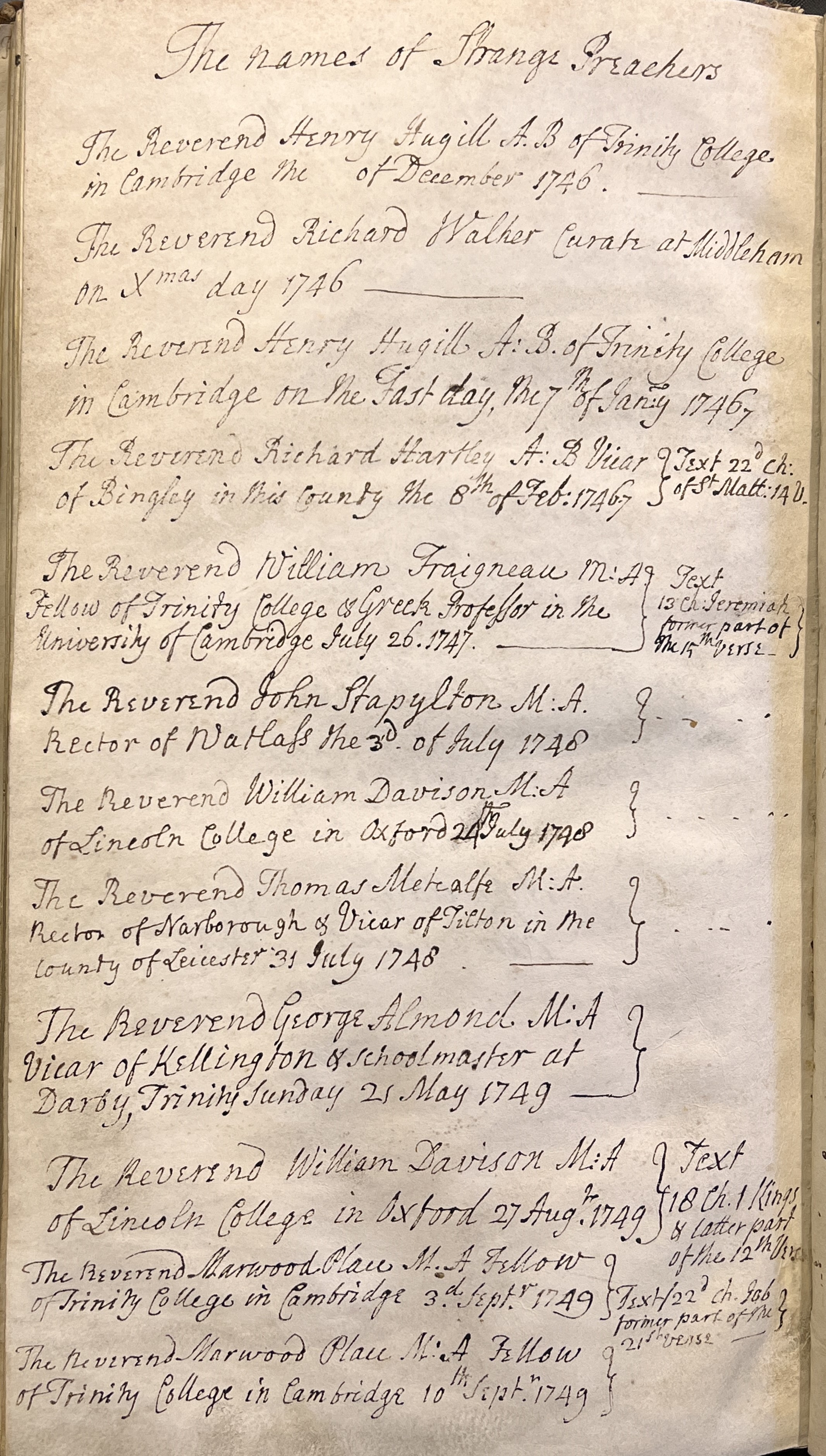 Canon 52 of the law of the Church of England, 1604 stipulated that the names of all strange preachers (preachers from outside the parish) were to be entered in a book kept for that purpose. This was to include their name, the day they preached and the name of the Bishop of whom he had license to preach. In the example from Bedale above, their name and the date are recorded, as well as their title, where they came from and, in most cases, the text they used to preach.