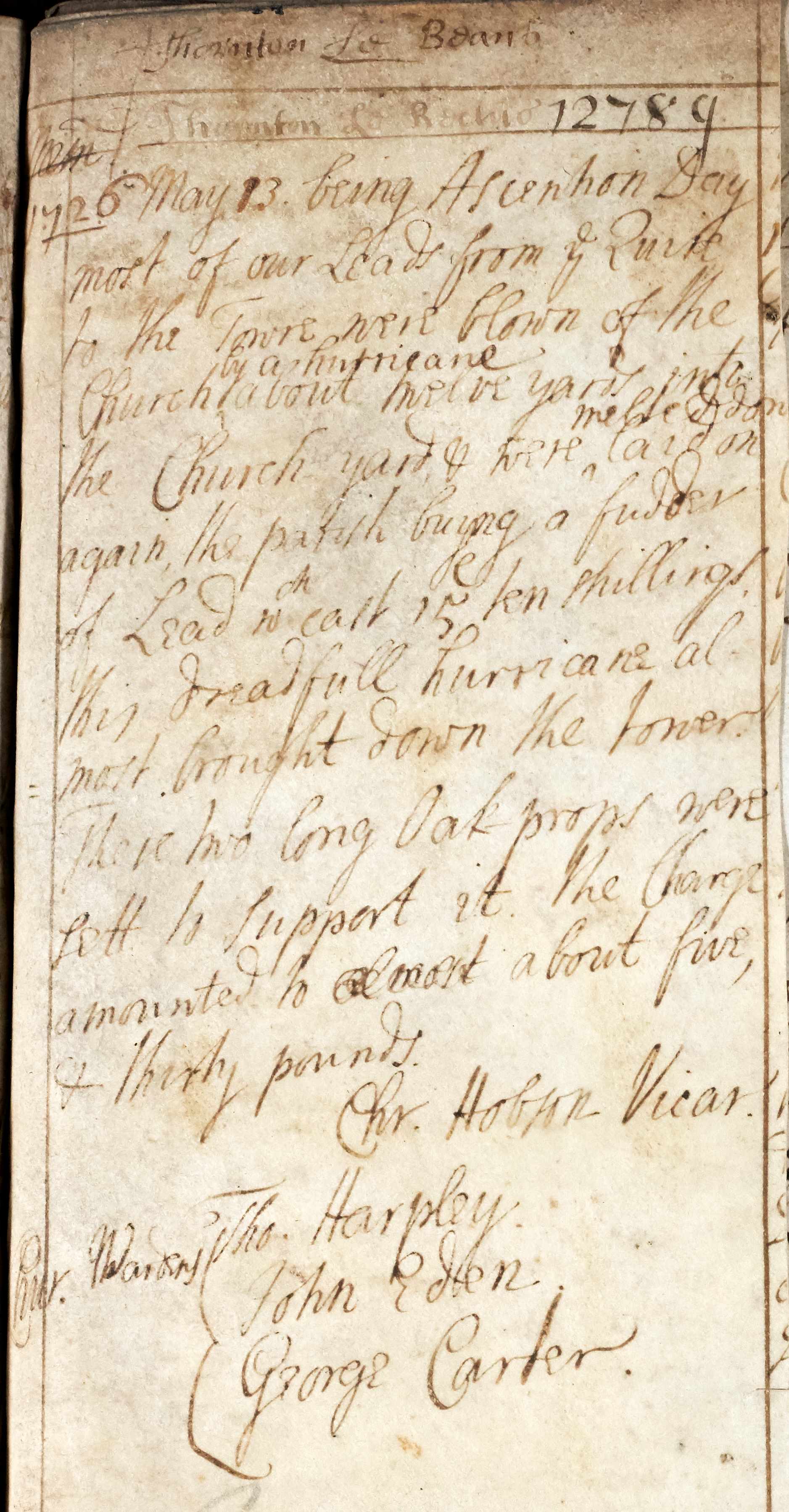 - L: North Otterington, St Michael & All Angels baptism, marriage and burial register, 1590-1750: “13 May 1726 being Ascension Day most of our leads from the quire to the tower were blown off the church by a hurricane…” [PR/OTN 1/1]