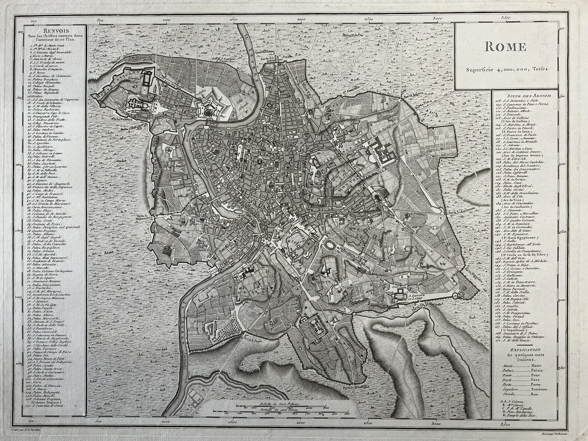 The map is based on the work of Italian Renaissance architect Pirro Ligorio (c.1512-1583), who studied the ancient monuments of Rome. In 1561, his topographical map of the ancient city, as it might have appeared during the reign of the Emperor Augustus (27 BC-14 AD), was published by Michael and Francisco Tramezzini. In later years, Ligorio’s map was reprinted several times from the original plates; by Carlo Losi, a bookseller and publisher of prints in Rome, in 1773 and later by Giovanni Scudellari around 1820/30, which may be the edition pictured above.