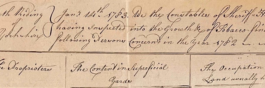 In a previous post, we explored the types of documents that form the working papers of the North Riding Quarter Sessions. This post focuses on an unusual set of documents that appeared in bundles for the Christmas and Midsummer Sessions of 1783. In January and July 1783, parish constables reported on the use of land for growing tobacco.… Read More Tobacco growing in the Vale of York in 1783