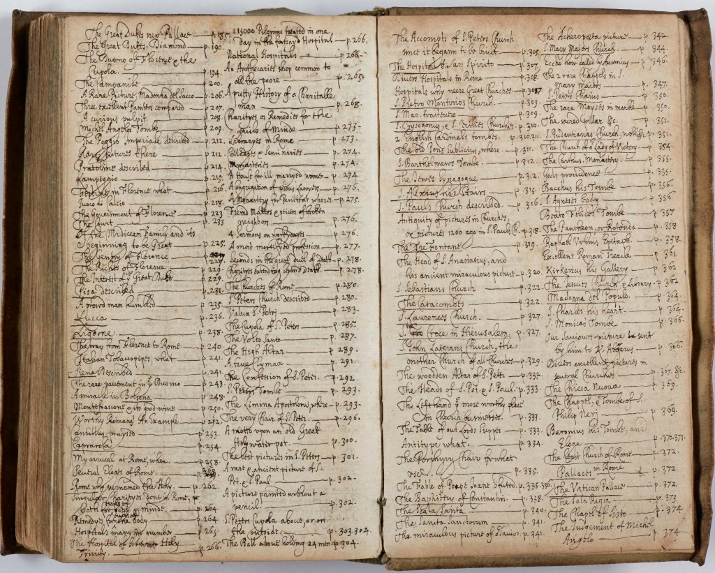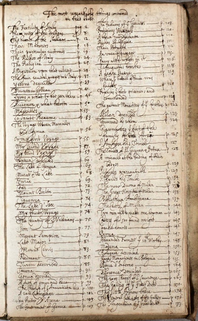Index pages of the handwritten version of A Voyage of Italy, c.1663 listing ‘The most remarkable things contained in this book’ [ZRL 9/6/1]
