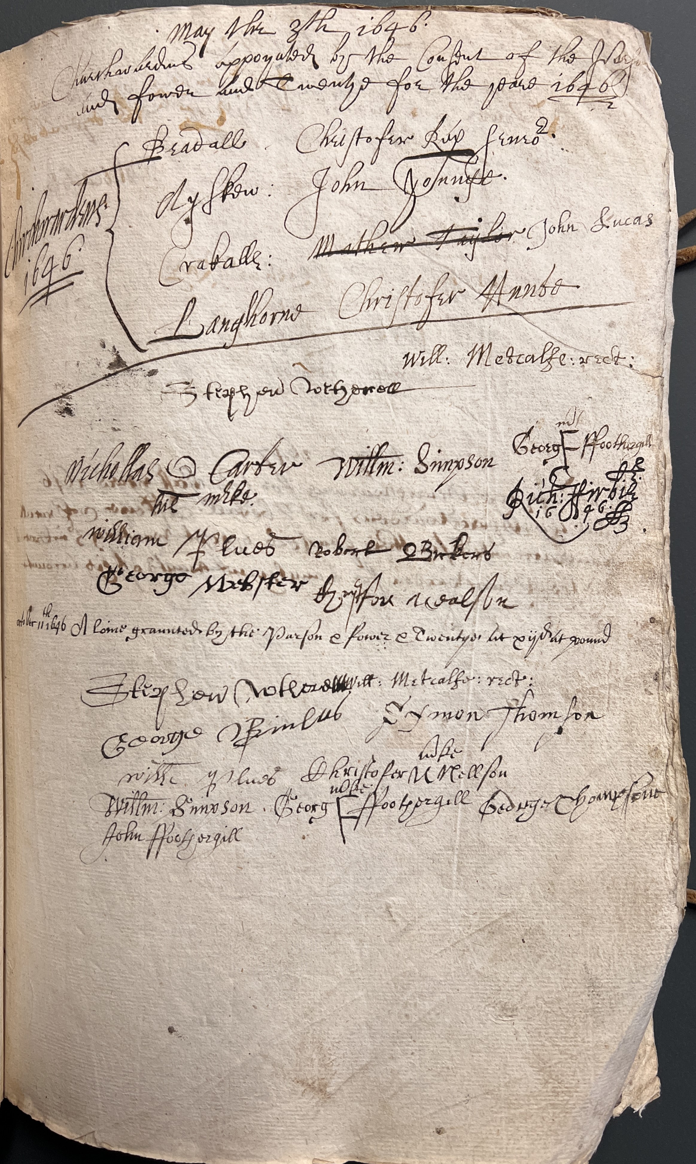 Bedale, St Gregory: churchwardens’ account book, 1576-1675 bound with parchment pages of medieval music, showing pages recording the appointment of churchwardens for the years 1644 and 1646, the signatures of the four and twenty (vestry members) authorising the churchwardens to collect arrears in March 1648 and Thomas Wittye of Bedale admitted as a brother to Christ’s Hospital, Firby, May 1649 [PR/BED 2/1]
