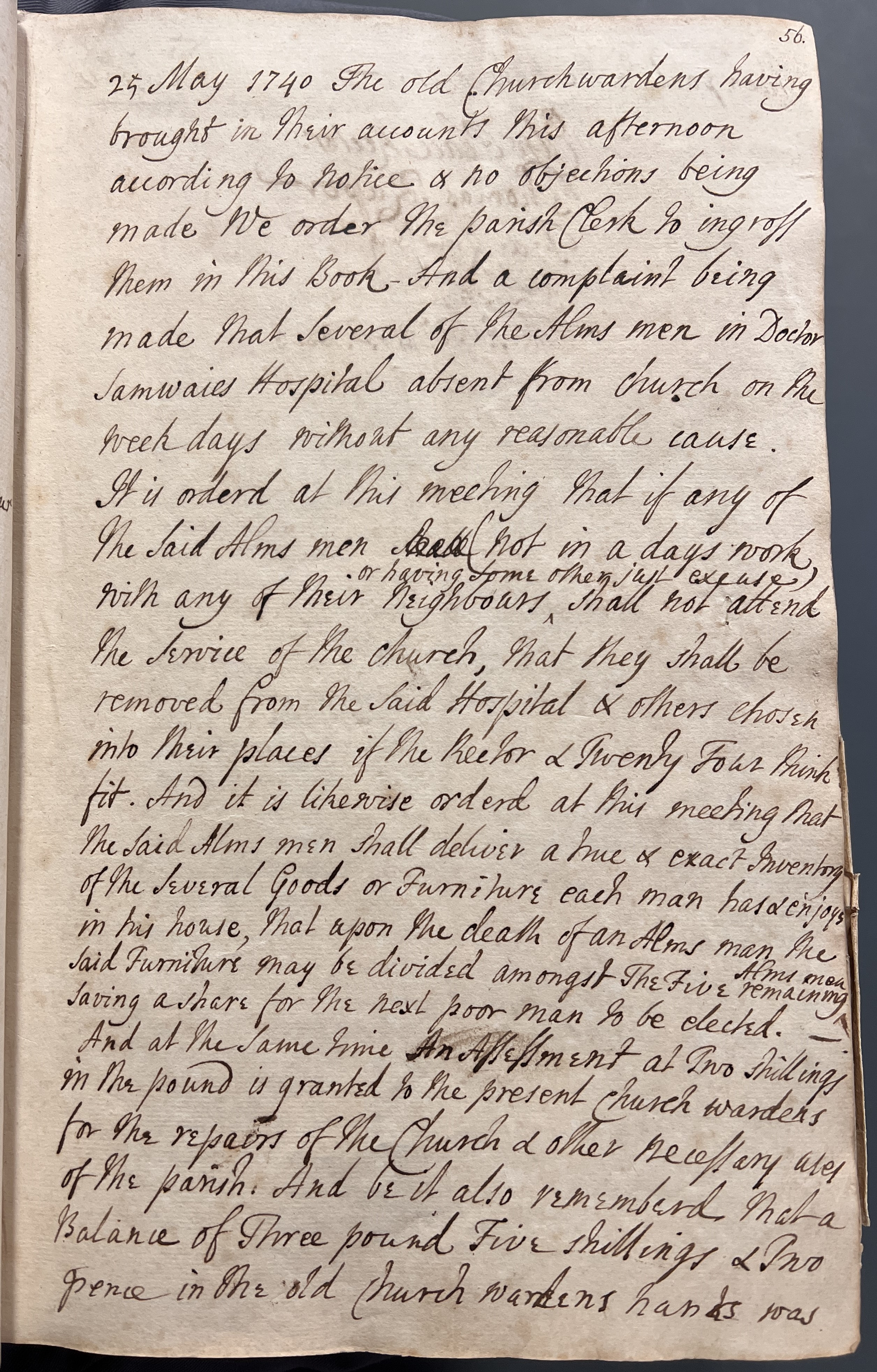 Bedale, St Gregory: Churchwardens’ account book 1734-1860, showing page of accounts for 1739 and a report on ‘a complaint that several of the alms men in Dr Samwaies Hospital were absent from church on the week days without any reasonable cause’ and that ‘if they do not have a just excuse, they shall be removed from the said hospital’, 25 May 1740 [PR/BED 2/3]