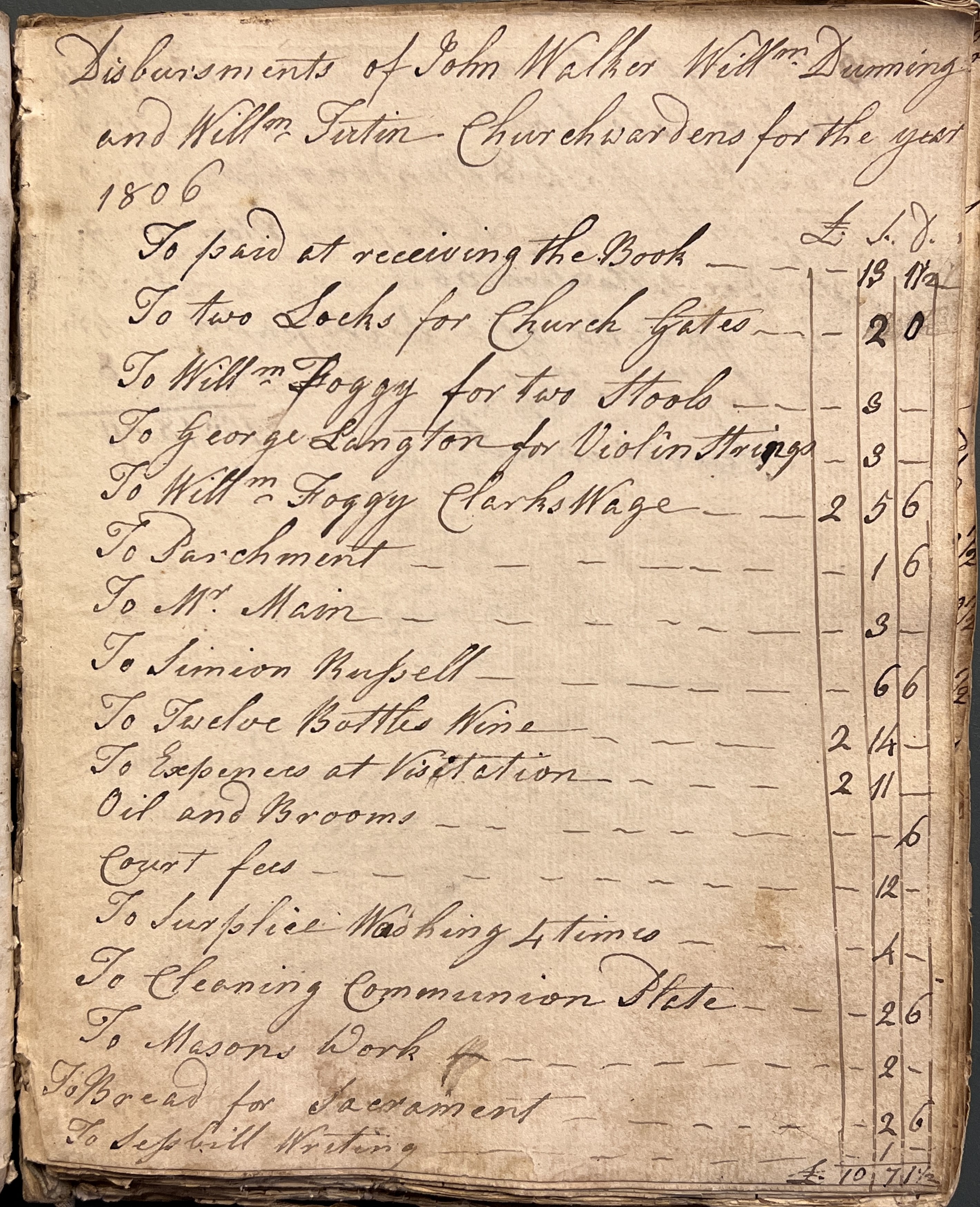 Kirby Sigston, St Lawrence: churchwardens’ account book, 1777-1847 showing decorated title page and disbursements (expenses) for the year 1806, including two locks for the church gates, violin strings, 12 bottles of wine, oil and brooms, surplice washing 4 times and cleaning the Communion plate [PR/KRS 4/1]