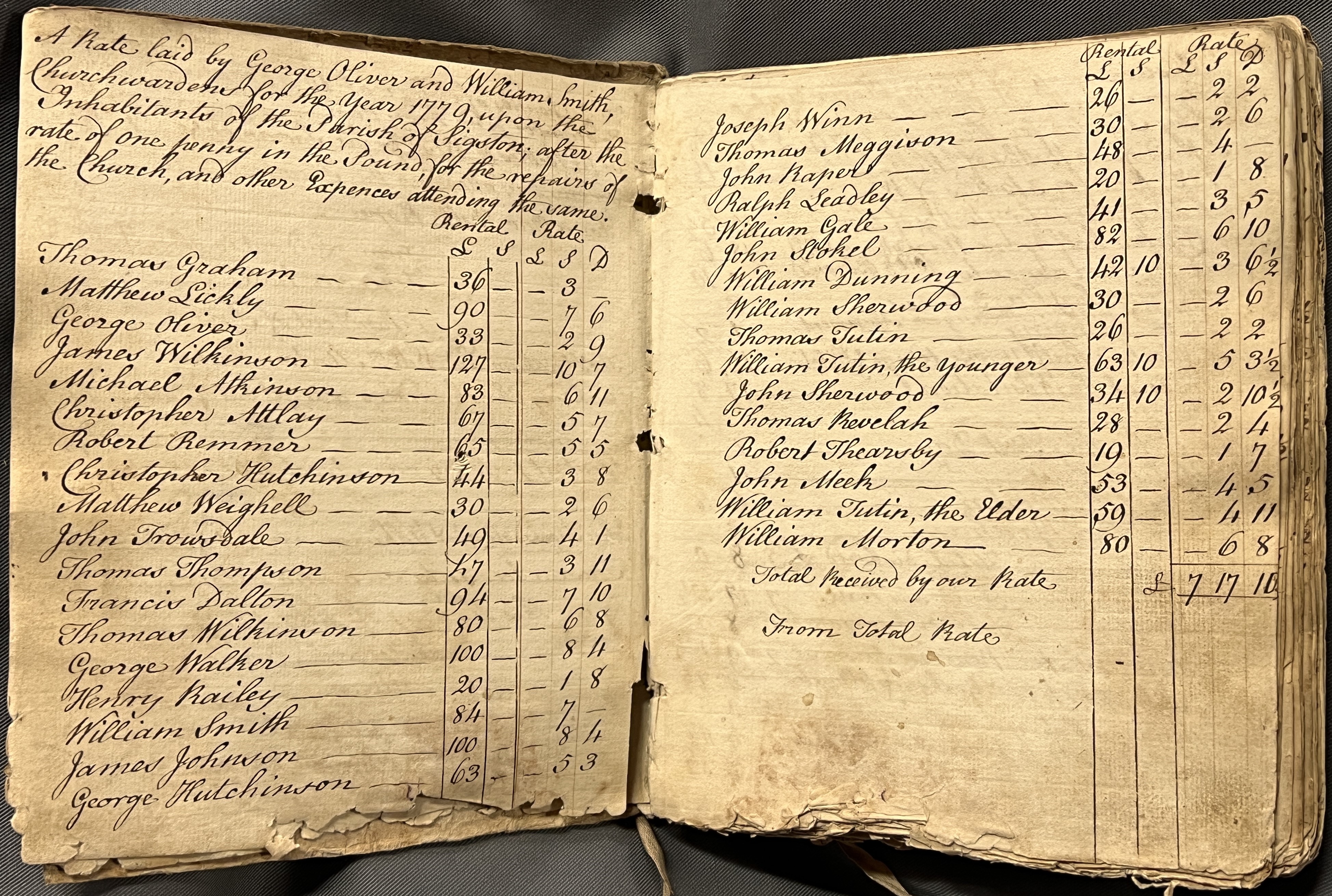 Kirby Sigston, St Lawrence: churchwardens’ account book, 1777-1847 showing pages recording rates levied by the churchwardens on inhabitants ‘for the repairs of the church and other expenses attending to the same’, for 1779 and the year ending 27 May 1828 [PR/KRS 4/1]