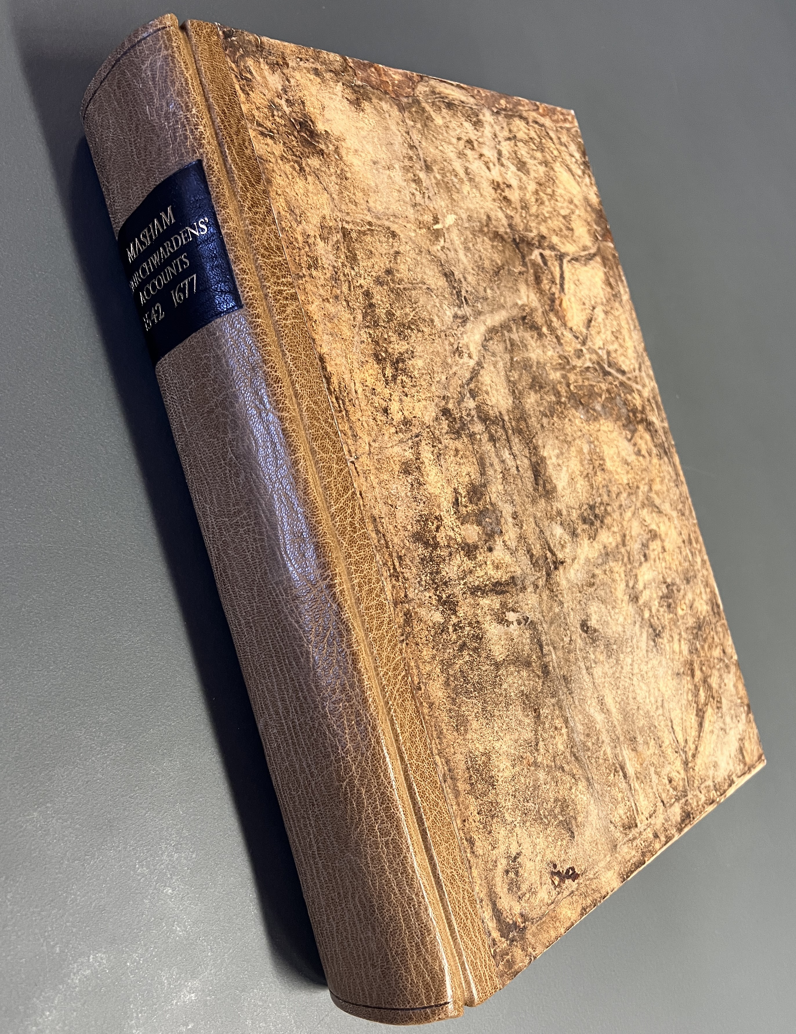 A handwritten description within the re-bound volume of Masham accounts reads: “Book of churchwardens’ accounts for the parish of Masham from the year 1542 to 1677 inclusive, containing many useful & curious things relating to the rights & customs of the Twenty Four, or select vestry of the said parish, viz their auditing all the parish accounts, settling rates for repairs of the church and other uses, granting warrants of distress upon such as were in arrear to the said rates, [?] the churchwardens &c.” A typewritten note with the account book states: “very few books of this sort exist in these parts. It is especially valuable as an illustration of the government of a small town in the 16th and 17th centuries“.