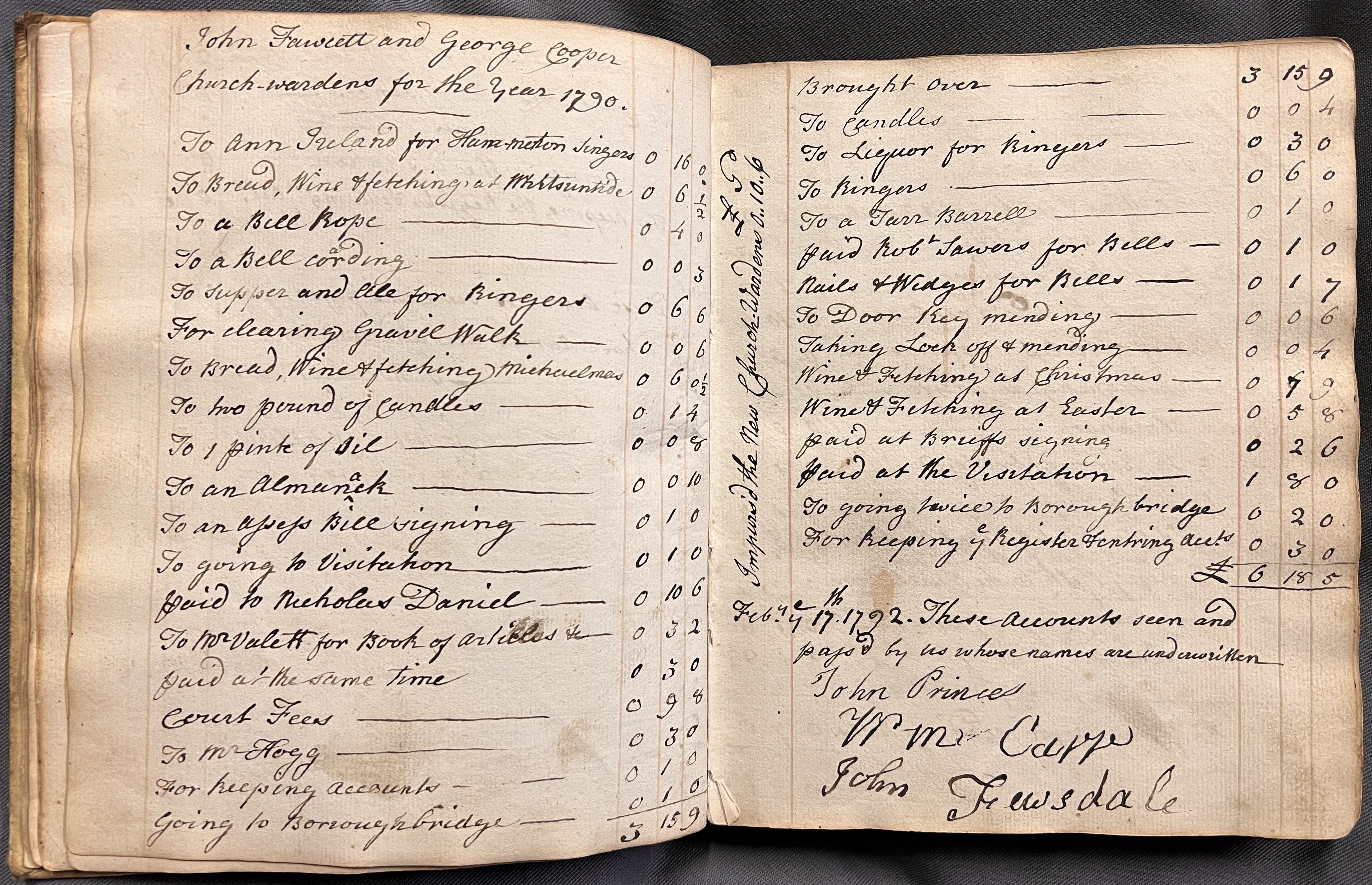 The above account book records the payments of John Fawcett and George Cooper, churchwardens for the year 1790. These payments include 16s (shillings) to Ann Ireland for Hammerton singers, 4s for bell rope, 6s 6d (old pence) for supper and ale for the ringers, 6d for clearing the gravel walk, 6s ½d for fetching bread and wine, and 1s 4d for two pound of candles.