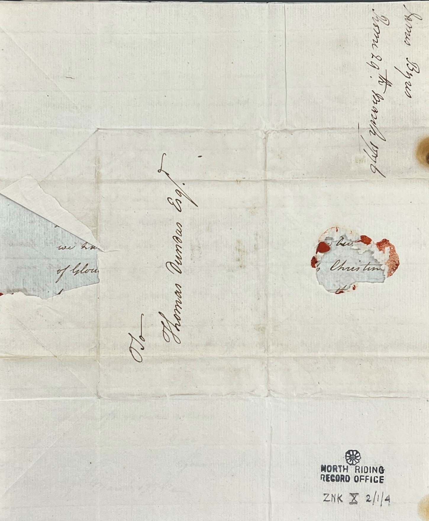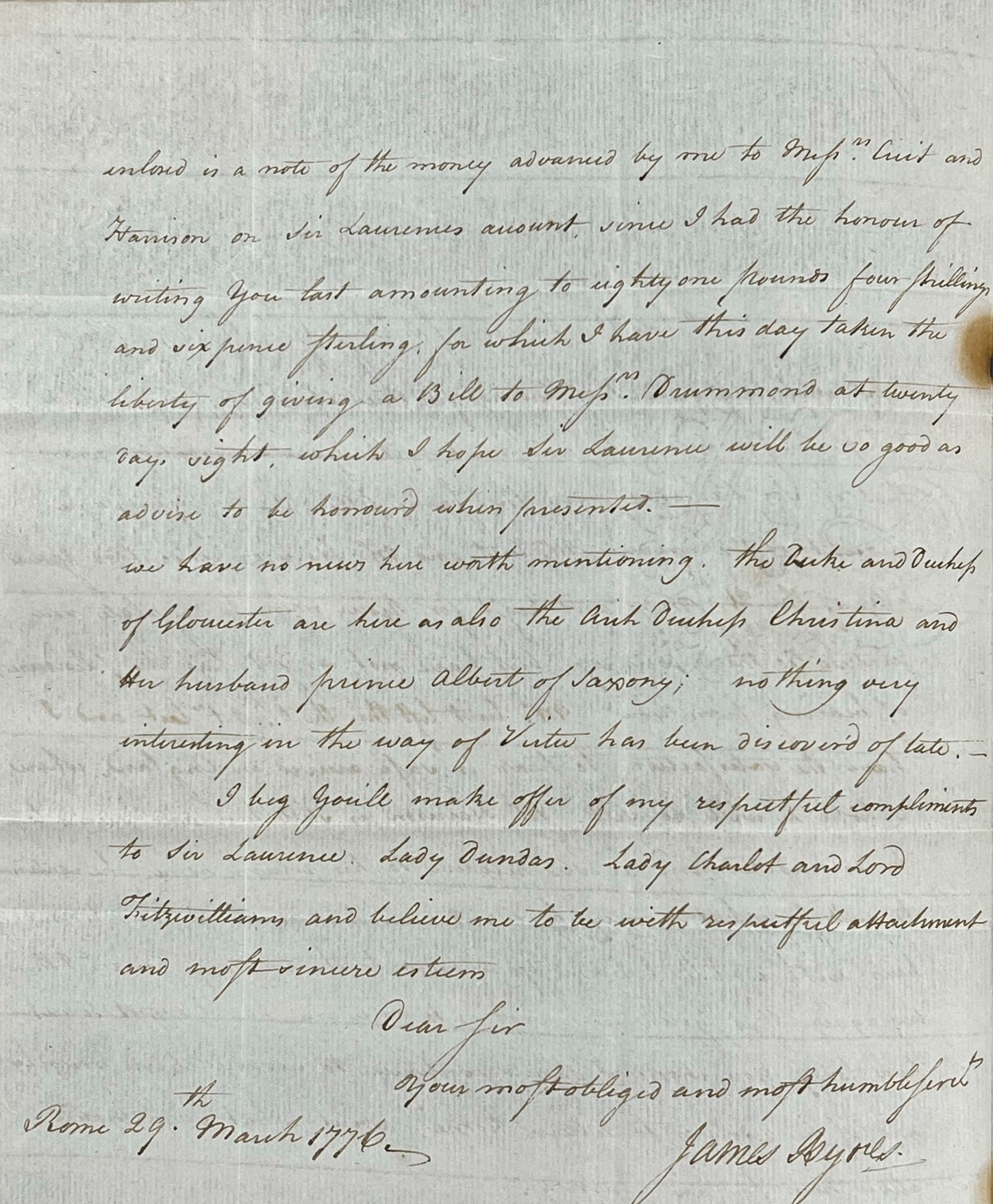 Letter from James Byres, Rome to Thomas Dundas regarding the expenses of George Cuit and Thomas Harrison in Italy, 29 March 1776 [ZNK X 2/1/4]