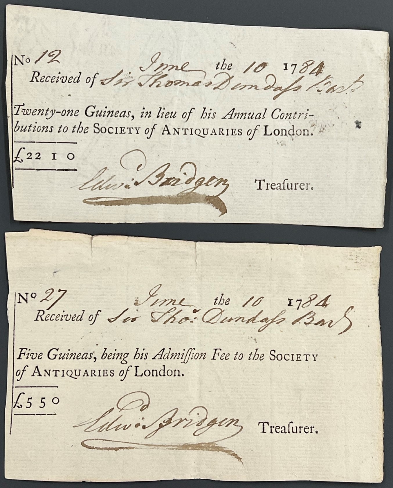 Receipts for Thomas Dundas’s admission fee and annual contribution to the Society of Antiquaries of London, 10 Jun 1784 [ZNK X 2/3/89-90]